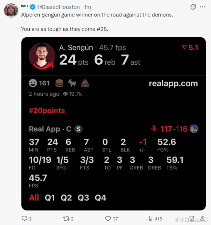 北京时间4月6日,火箭以117-116击败勇士拿到六连胜。这场比赛阿尔佩伦-申京在末节最后时刻完成一个关键2+1,终场前11.1秒完成准绝杀的抛投,虽然乌度卡对他末节的一些选择不满,可决胜时刻还是信赖这位23岁的超级明星,申京24+7+6+2盖帽帮助火箭击败勇士。